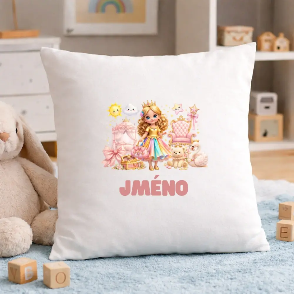 Ilustrace princezny s královskými doplňky, zvířátky a pastelovými barvami působí něžně, hravě a luxusně zároveň. Díky personalizaci jménem je polštář originální a jedinečný, přesně pro konkrétní dítě.