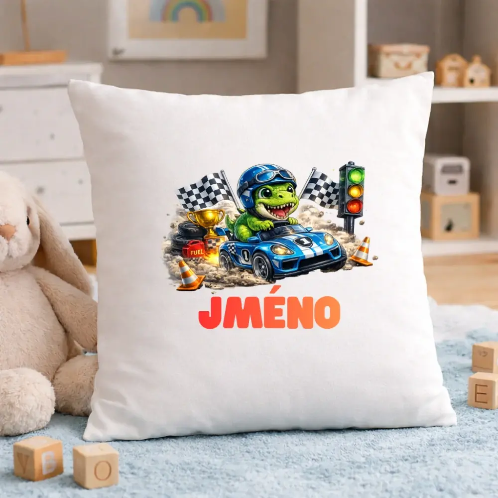Dětský polštář se jménem – Závodní dinosaurus v autě