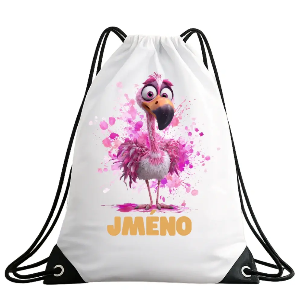 Tento dětský vak se jménem a veselým růžovým plameňákem je jako stvořený pro děti, které milují barvy, zábavu a originální doplňky 🦩✨