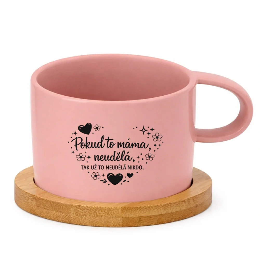 Jemná typografie doplněná srdíčky a kvítky působí něžně a hřejivě – přesně tak, jak si maminky zaslouží ☕🌼