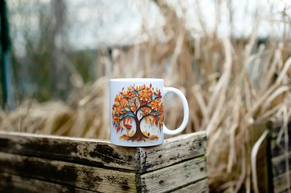 Motiv podzimního stromu a květů pokrývá celý hrnek, takže si můžete užívat jeho krásu z jakéhokoliv úhlu.Povrch: Lesklý a hladký