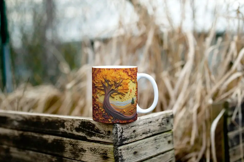 Motiv stromu a podzimního listí pokrývá celý hrnek, takže si můžete užívat krásu tohoto podzimního motivu z každého úhlu.Povrch: Lesklý a hladký