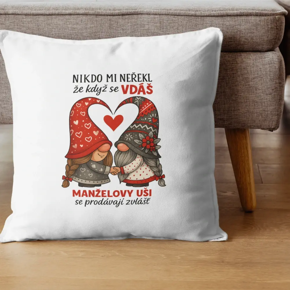 Tenhle polštář s trefným nápisem „Manželovy uši se prodávají zvlášť“ je přesně ten typ dárku, který mluví za vše 😄