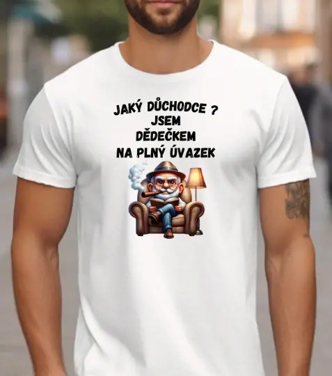 Motiv „Jaký důchodce? Jsem dědečkem na plný úvazek“ s pohodovým animovaným dědou v křesle krásně vystihuje realitu mnoha aktivních dědečků. Humor, životní nadhled a styl v jednom tričku – perfektní volba pro každodenní nošení, rodinné oslavy nebo jako originální dárek.