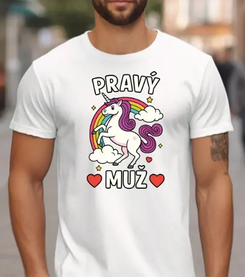 Motiv „Pravý muž“ s jednorožcem, duhou a srdíčky kombinuje jemnost, nadsázku a humor. Je ideální pro muže, kteří se nebojí být originální, vtipní a trochu odlišní. Perfektní způsob, jak ukázat, že „pravý muž“ je ten, který si ze sebe umí udělat srandu.