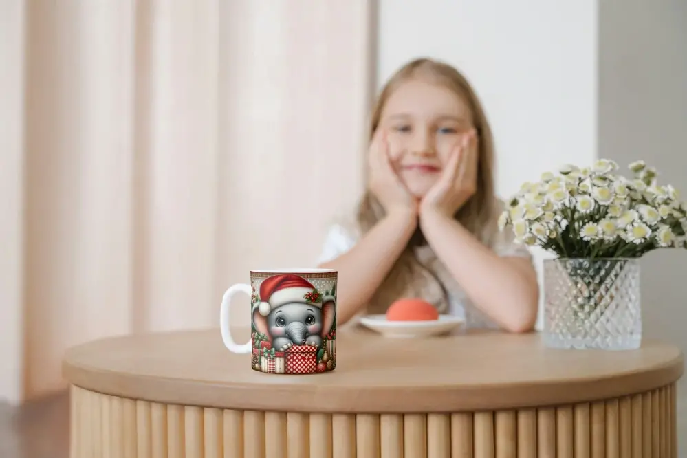 Veselý sloník v červené santovské čepici, obklopený vánočními dekoracemi a dárky, vykouzlí úsměv při každém doušku kávy nebo čaje. Hrnek se skvěle hodí do vánočně laděné kuchyně i jako stylový doplněk na sváteční stůl.
