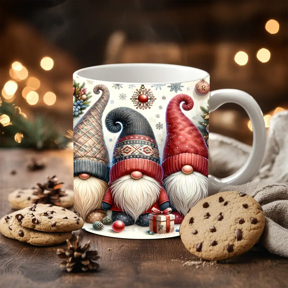 Tento krásný hrnek se třemi skřítky v teplých zimních čepicích přináší klid, pohodu a tu pravou vánoční atmosféru. Kombinace červené, šedé a hnědé barvy působí elegantně a útulně – ideální pro chvíle u vánočního stromečku.